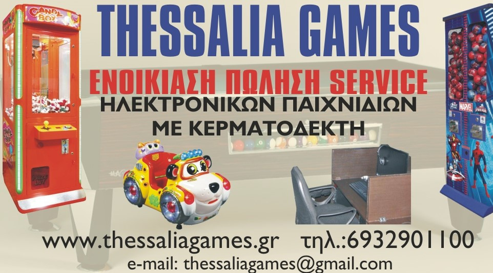 Ιδρυθήκαμε με έδρα την Θεσσαλία. Απευθυνόμαστε όμως σε όλη την Ελλάδα. Από το έτος ίδρυσης της επιχείρησης έως και σήμερα, με προσοχή και πολύ μεράκι στην δουλειά μας, η thessaliagames έχει επεκταθεί σε διάφορες πόλεις τις Ελλάδος. Ιδιοκτήτης και προσωπικό με πολυετή εμπειρία στον χώρο των ηλεκτρονικών - ψυχαγωγικών παιχνιδιών με κερματοδέκτη, εγγυώνται το επιθυμητό αποτέλεσμα στους μελλοντικούς συνεργάτες μας. Η επάνδρωση του χώρου σας με παιδικά παιχνίδια ή το “στήσιμο” από την αρχή ενός Internet cafe αποτελεί για εμάς μία ακόμη πρόκληση. Τα χαρακτηριστικά που θα καθορίσουν την συνεργασία μας είναι: Άριστης Ποιότητας Εξοπλισμός, πλήρους ελεγχόμενος από τους τεχνικούς μας. Άμεση Εξυπηρέτηση & Αξιοπιστία στις ενοικιάσεις μηχανημάτων ή τη συνεκμετάλλευσή τους. Πώληση μηχανημάτων, καινούργιων και μεταχειρισμένων αρίστης ποιότητας, καθώς και διαφόρων αξεσούαρ και ανταλλακτικών. Φιλοσοφία μας είναι η παροχή ολοκληρωμένων υπηρεσιών στον χώρο των Ηλεκτρονικών Παιχνιδιών με κερματοδέκτες. Η αξιοπιστία της επιχείρησης όλα αυτά τα χρόνια στην αγορά, είχε ως αποτέλεσμα τη σταθερά ανοδική πορεία μας και φυσικά τη συνεχή εξέλιξή μας. Αποτέλεσμα όλων αυτών των ενεργειών ήταν η απόκτηση μακροχρόνιων συνεργασιών, πάντα με το επιθυμητό αποτέλεσμα τόσο για εμάς όσο και για τους συνεργάτες μας.
